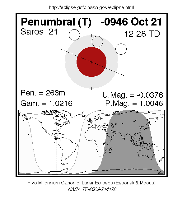 A penumbral eclipse of the Moon occurred on 21 October, 0947 BC UT Old Style, with maximum eclipse at 05:42 UT. In a rare total penumbral eclipse, the entire Moon was partially shaded by the Earth (though none of it was in complete shadow), and the shading across the Moon should have been quite visible at maximum eclipse. The penumbral phase lasted for 4 hours and 26 minutes in all, though for most of it, the eclipse was extremely difficult or impossible to see.