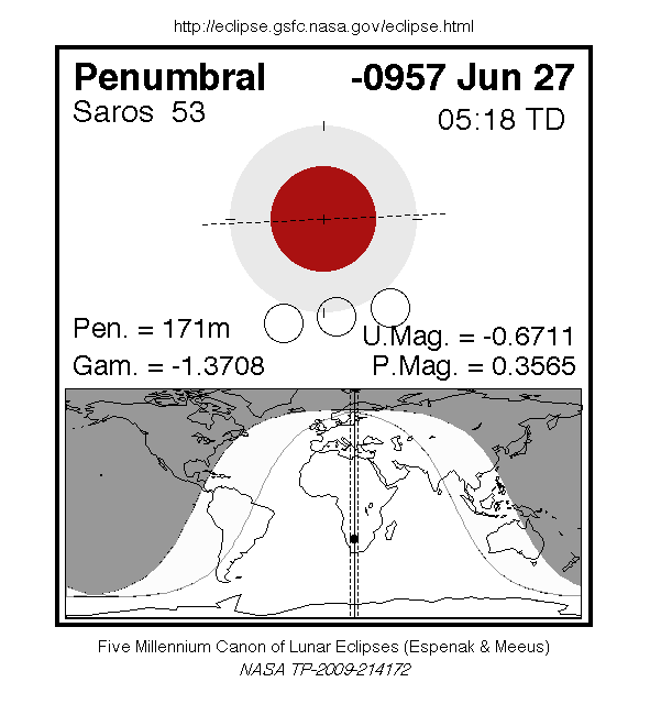 A penumbral eclipse of the Moon occurred on 26 June, 0958 BC UT Old Style, with maximum eclipse at 22:28 UT. This very subtle penumbral eclipse was essentially invisible to the naked eye; though it lasted 2 hours and 51 minutes, just 36% of the Moon's disc was in partial shadow (with no part of it in complete shadow).
