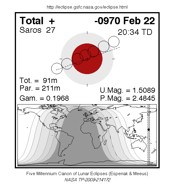 A total eclipse of the Moon occurred on 22 February, 0971 BC UT Old Style, with maximum eclipse at 13:41 UT. The Moon was plunged into darkness for 1 hour and 31 minutes, in a deep total eclipse which saw the Moon 51% of its diameter inside the Earth's umbral shadow. The visual effect of this depends on the state of the Earth's atmosphere, but the Moon may have been stained a deep red colour. The partial eclipse lasted for 3 hours and 31 minutes in total.