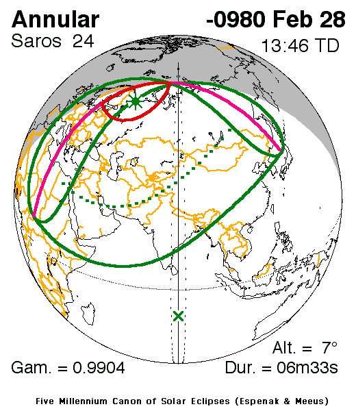 An annular eclipse of the Sun occurred on 28 February, 0981 BC UT Old Style, with maximum eclipse at 06:49 UT. This marginal annular eclipse lasted 6 minutes and 33 seconds, with the annular path covering a small area in the north polar regions.