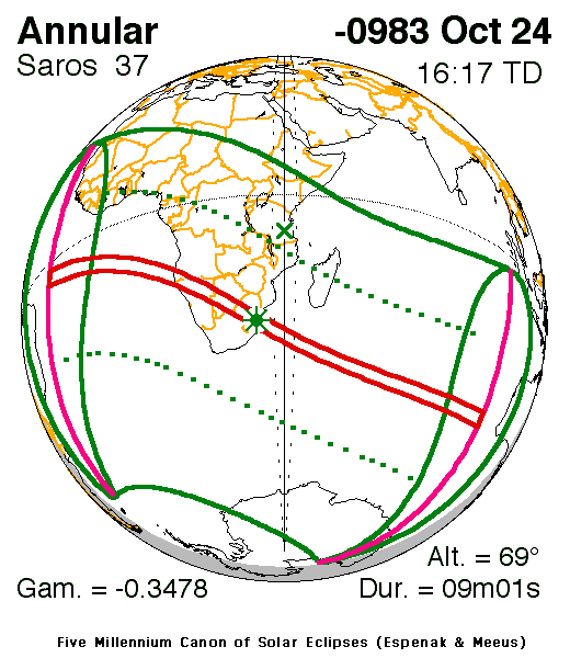 An annular eclipse of the Sun occurred on 24 October, 0984 BC UT Old Style, with maximum eclipse at 09:20 UT. A small annular eclipse covered only 92% of the Sun in a very broad path, 303 km wide at maximum, and lasted 9 minutes and 1 second.