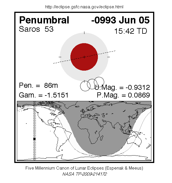 A penumbral eclipse of the Moon occurred on 5 June, 0994 BC UT Old Style, with maximum eclipse at 08:41 UT. In this extremely marginal eclipse, the Moon barely clipped the edge of the Earth's penumbral shadow. This caused a microscopic darkening of just 9% of the Moon's disc for 1 hour and 26 minutes, which was essentially impossible to see.