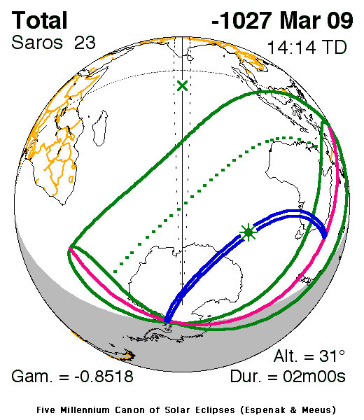 A total eclipse of the Sun occurred on 9 March, 1028 BC UT Old Style, with maximum eclipse at 07:04 UT. A dramatic total eclipse plunged the Sun into darkness for 2 minutes exactly at maximum, creating an amazing spectacle for observers in a broad path up to 194 km wide.