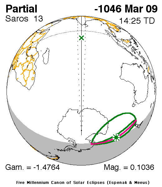 A partial eclipse of the Sun occurred on 9 March, 1047 BC UT Old Style, with maximum eclipse at 07:08 UT. With only 10% of the Sun covered at maximum eclipse, this was a very marginal eclipse at best, and rather uninteresting.