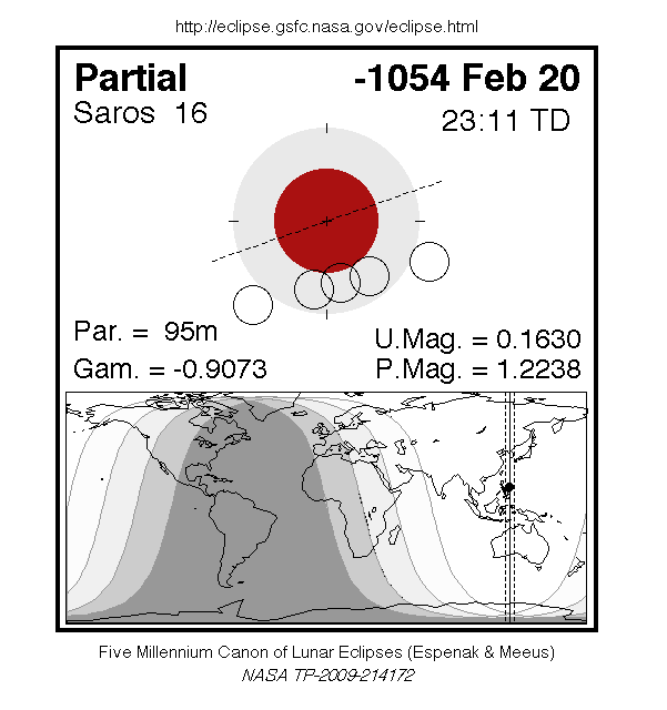 A partial eclipse of the Moon occurred on 20 February, 1055 BC UT Old Style, with maximum eclipse at 15:52 UT. At maximum eclipse, a small bite out of the Moon should have been visible. The eclipse lasted for 1 hour and 35 minutes, with just 16% of the Moon in shadow at maximum.