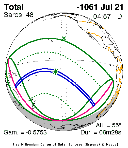 A total eclipse of the Sun occurred on 20 July, 1062 BC UT Old Style, with maximum eclipse at 21:36 UT. A dramatic total eclipse plunged the Sun into darkness for 6 minutes and 28 seconds at maximum, creating an amazing spectacle for observers in a very broad path, 281 km wide at maximum.