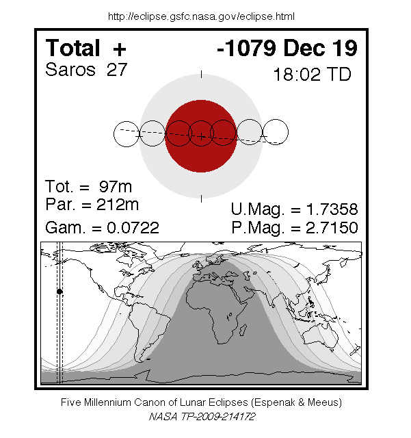 A total eclipse of the Moon occurred on 19 December, 1080 BC UT Old Style, with maximum eclipse at 10:36 UT. A dramatic total eclipse lasting 1 hour and 37 minutes plunged the full Moon into deep darkness, as it passed right through the centre of the Earth's umbral shadow. While the visual effect of a total eclipse is variable, the Moon may have been stained a deep orange or red colour at maximum eclipse. This was a great spectacle for everyone who saw it. The partial eclipse lasted for 3 hours and 32 minutes in total.