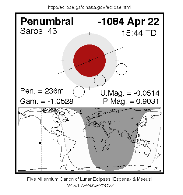 A penumbral eclipse of the Moon occurred on 22 April, 1085 BC UT Old Style, with maximum eclipse at 08:16 UT. At maximum eclipse, 90% of the Moon's disc was partially shaded by the Earth, which caused a slight shadow gradient across its disc; this subtle effect may have been visible to careful observers. No part of the Moon was in complete shadow. The eclipse lasted 3 hours and 56 minutes overall.