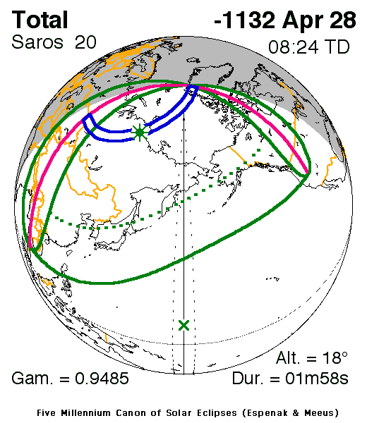 A total eclipse of the Sun occurred on 28 April, 1133 BC UT Old Style, with maximum eclipse at 00:42 UT. The Sun was darkened for 1 minute and 58 seconds by a dramatic total eclipse covering a very broad path, 360 km wide at maximum. This was a sight worth seeing.