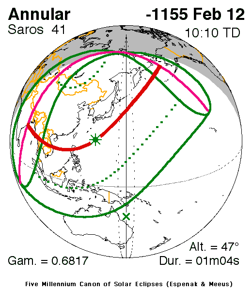 An annular eclipse of the Sun occurred on 12 February, 1156 BC UT Old Style, with maximum eclipse at 02:20 UT. A large annular eclipse covered 99% of the Sun, creating a dramatic spectacle for observers in a narrow path at most 50 km wide; it lasted 1 minute and 4 seconds at the point of maximum eclipse.