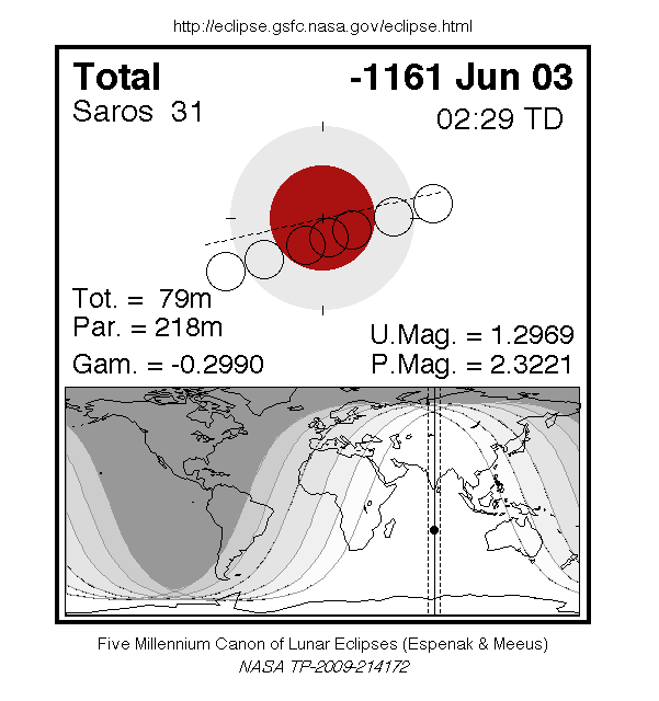 A total eclipse of the Moon occurred on 2 June, 1162 BC UT Old Style, with maximum eclipse at 18:37 UT. The Moon was plunged into darkness for 1 hour and 19 minutes, in a deep total eclipse which saw the Moon 30% of its diameter inside the Earth's umbral shadow. The visual effect of this depends on the state of the Earth's atmosphere, but the Moon may have been stained a deep red colour. The partial eclipse lasted for 3 hours and 38 minutes in total.