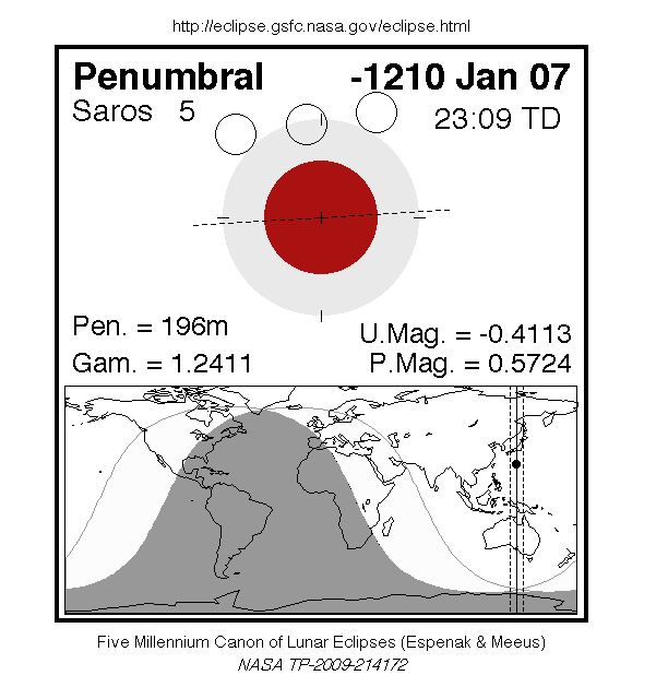 A penumbral eclipse of the Moon occurred on 7 January, 1211 BC UT Old Style, with maximum eclipse at 15:01 UT. This very subtle penumbral eclipse was essentially invisible to the naked eye; though it lasted 3 hours and 16 minutes, just 57% of the Moon's disc was in partial shadow (with no part of it in complete shadow).