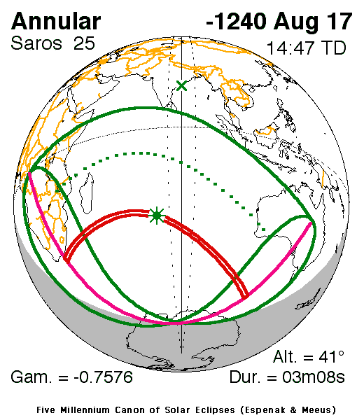 An annular eclipse of the Sun occurred on 17 August, 1241 BC UT Old Style, with maximum eclipse at 06:30 UT. A large annular eclipse covered 97% of the Sun, creating a dramatic spectacle for observers in a path up to 159 km wide; it lasted 3 minutes and 8 seconds at the point of maximum eclipse.