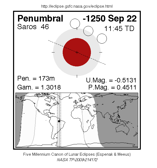 A penumbral eclipse of the Moon occurred on 22 September, 1251 BC UT Old Style, with maximum eclipse at 03:24 UT. This very subtle penumbral eclipse was essentially invisible to the naked eye; though it lasted 2 hours and 53 minutes, just 45% of the Moon's disc was in partial shadow (with no part of it in complete shadow).