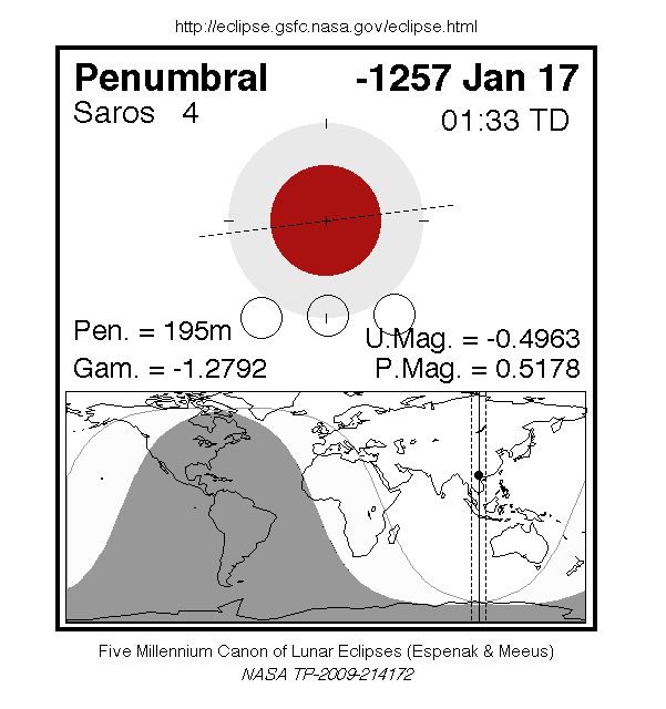 A penumbral eclipse of the Moon occurred on 16 January, 1258 BC UT Old Style, with maximum eclipse at 17:11 UT. This very subtle penumbral eclipse was essentially invisible to the naked eye; though it lasted 3 hours and 15 minutes, just 52% of the Moon's disc was in partial shadow (with no part of it in complete shadow).