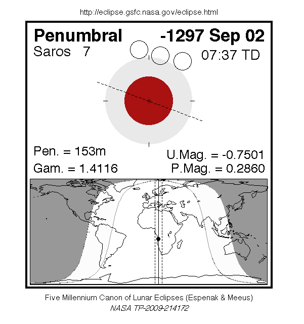 A penumbral eclipse of the Moon occurred on 1 September, 1298 BC UT Old Style, with maximum eclipse at 23:02 UT. This very subtle penumbral eclipse was essentially invisible to the naked eye; though it lasted 2 hours and 33 minutes, just 29% of the Moon's disc was in partial shadow (with no part of it in complete shadow).