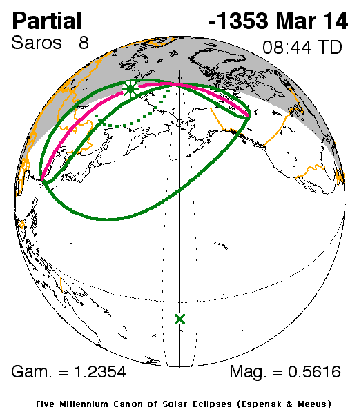 A partial eclipse of the Sun occurred on 13 March, 1354 BC UT Old Style, with maximum eclipse at 23:49 UT. A moderate partial eclipse, with 56% of the Sun covered for viewers closest to the center, created an interesting spectacle.