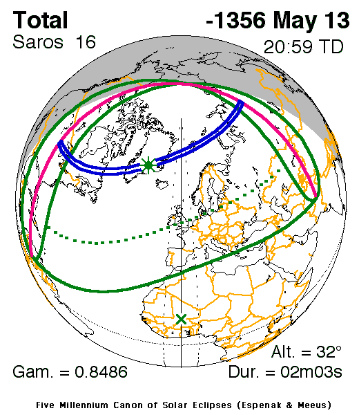 A total eclipse of the Sun occurred on 13 May, 1357 BC UT Old Style, with maximum eclipse at 12:04 UT. A dramatic total eclipse plunged the Sun into darkness for 2 minutes and 3 seconds at maximum, creating an amazing spectacle for observers in a broad path up to 203 km wide.