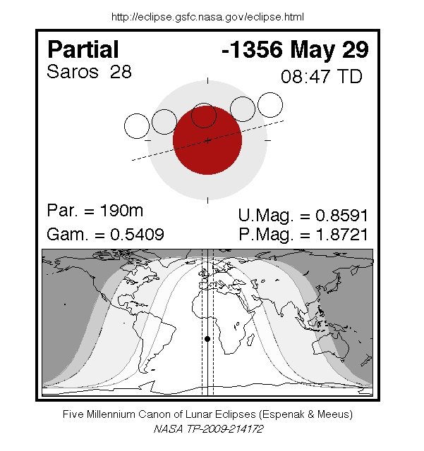 A partial eclipse of the Moon occurred on 28 May, 1357 BC UT Old Style, with maximum eclipse at 23:51 UT. The Moon was strikingly shadowed in this deep partial eclipse which lasted 3 hours and 10 minutes, with 86% of the Moon in darkness at maximum.