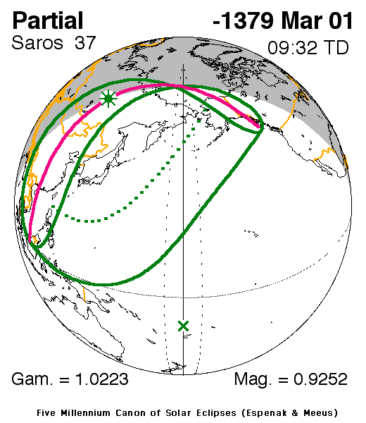 A partial eclipse of the Sun occurred on 1 March, 1380 BC UT Old Style, with maximum eclipse at 00:28 UT. This was a deep partial eclipse, with 93% of the Sun covered for viewers closest to the center. This provided a significant spectacle for those who saw it.