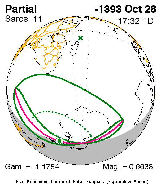 A partial eclipse of the Sun occurred on 28 October, 1394 BC UT Old Style, with maximum eclipse at 08:24 UT. A moderate partial eclipse, with 66% of the Sun covered for viewers closest to the center, created an interesting spectacle.