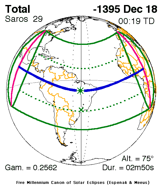 A total eclipse of the Sun occurred on 17 December, 1396 BC UT Old Style, with maximum eclipse at 15:10 UT. A dramatic total eclipse plunged the Sun into darkness for 2 minutes and 50 seconds at maximum, creating an amazing spectacle for observers in a path up to 97 km wide.