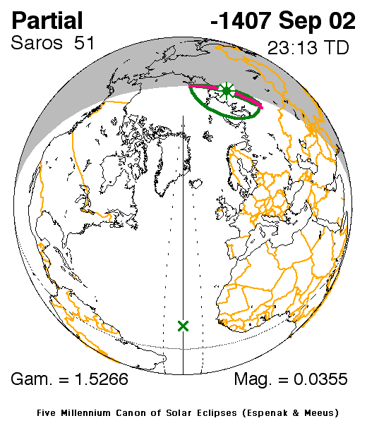 A partial eclipse of the Sun occurred on 2 September, 1408 BC UT Old Style, with maximum eclipse at 14:00 UT. With only 4% of the Sun covered at maximum eclipse, this was a very marginal eclipse at best, and rather uninteresting.