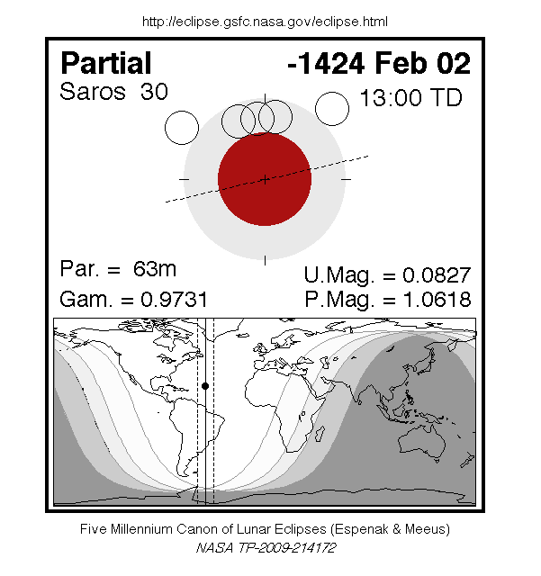 A partial eclipse of the Moon occurred on 2 February, 1425 BC UT Old Style, with maximum eclipse at 03:41 UT. A tiny bite out of the Moon may have been visible at maximum, though just 8% of the Moon was shadowed in a partial eclipse which lasted for 1 hour and 3 minutes. A shading across the moon from the Earth's penumbral shadow should have been visible at maximum eclipse.