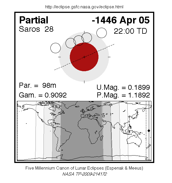 A partial eclipse of the Moon occurred on 5 April, 1447 BC UT Old Style, with maximum eclipse at 12:34 UT. At maximum eclipse, a small bite out of the Moon should have been visible. The eclipse lasted for 1 hour and 38 minutes, with just 19% of the Moon in shadow at maximum.