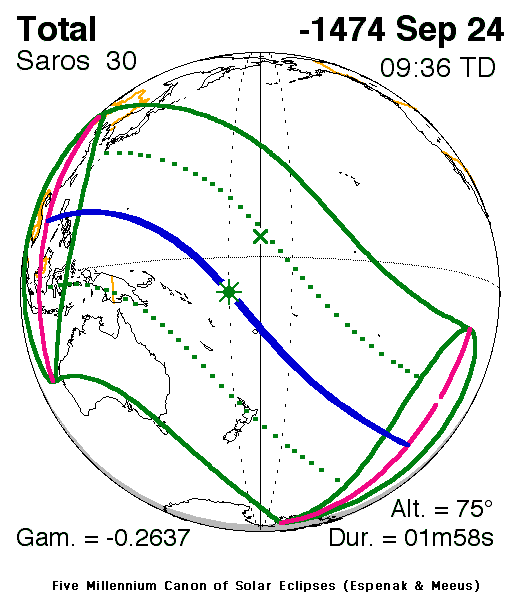 A total eclipse of the Sun occurred on 24 September, 1475 BC UT Old Style, with maximum eclipse at 00:00 UT. The Sun was darkened for 1 minute and 58 seconds by a dramatic total eclipse covering a narrow path at most 78 km wide. This was a sight worth seeing.