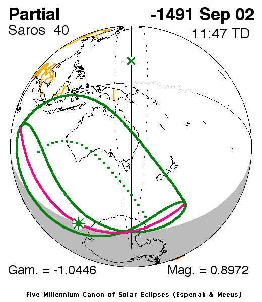 A partial eclipse of the Sun occurred on 2 September, 1492 BC UT Old Style, with maximum eclipse at 02:05 UT. This was a deep partial eclipse, with 90% of the Sun covered for viewers closest to the center. This provided a significant spectacle for those who saw it.