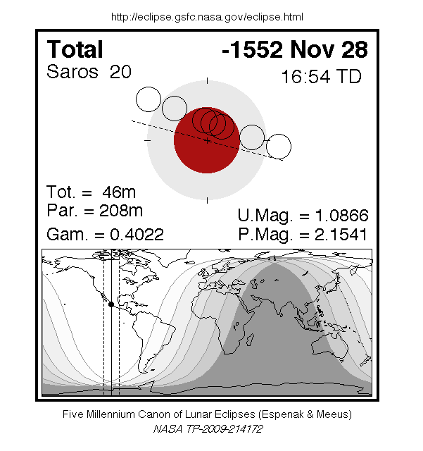 A total eclipse of the Moon occurred on 28 November, 1553 BC UT Old Style, with maximum eclipse at 06:50 UT. A shallow total eclipse saw the Moon in relative darkness for 45 minutes and 54 seconds. The Moon was 9% of its diameter into the Earth's umbral shadow, and should have been significantly darkened. The partial eclipse lasted for 3 hours and 28 minutes in total.