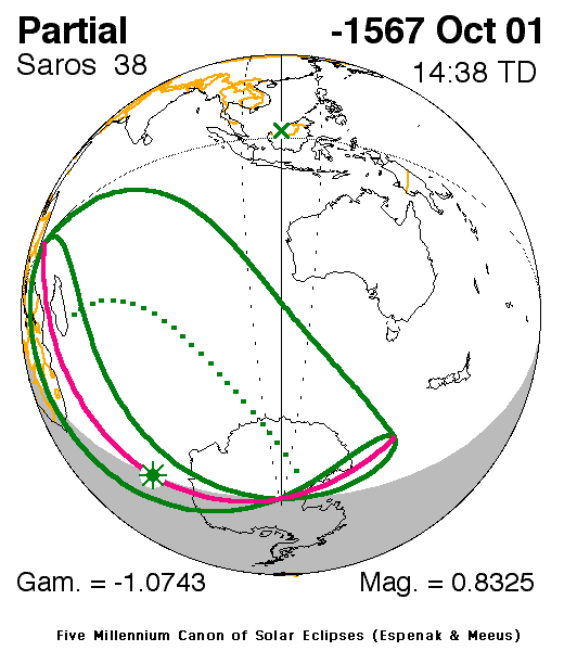A partial eclipse of the Sun occurred on 1 October, 1568 BC UT Old Style, with maximum eclipse at 04:29 UT. This was a deep partial eclipse, with 83% of the Sun covered for viewers closest to the center. This provided a significant spectacle for those who saw it.