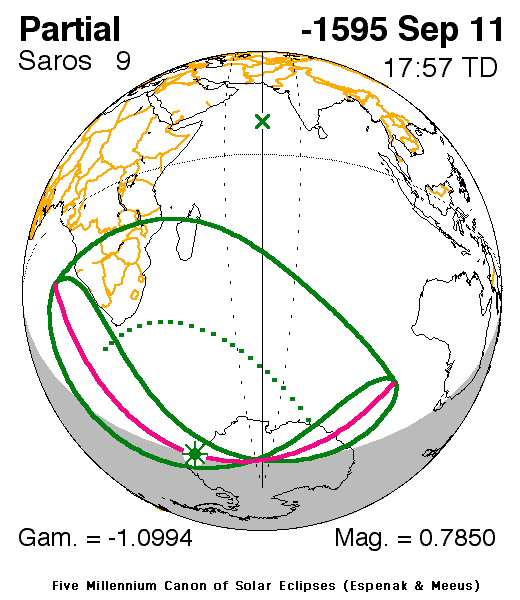 A partial eclipse of the Sun occurred on 11 September, 1596 BC UT Old Style, with maximum eclipse at 07:38 UT. A moderate partial eclipse, with 79% of the Sun covered for viewers closest to the center, created an interesting spectacle.
