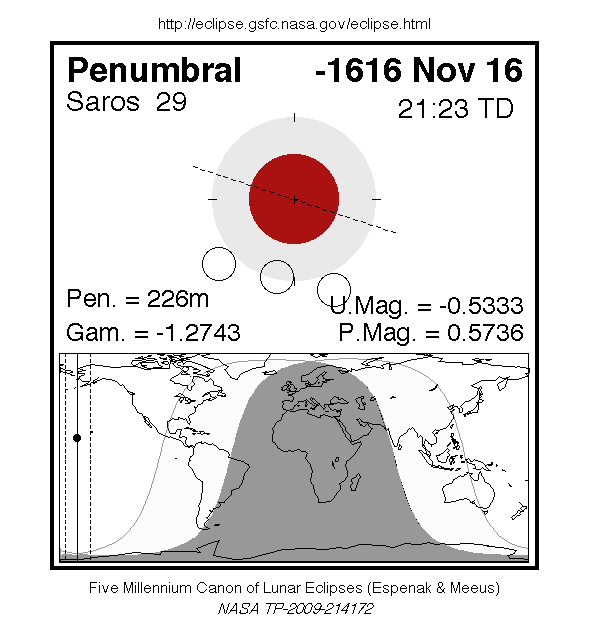 A penumbral eclipse of the Moon occurred on 16 November, 1617 BC UT Old Style, with maximum eclipse at 10:57 UT. This very subtle penumbral eclipse was essentially invisible to the naked eye; though it lasted 3 hours and 46 minutes, just 57% of the Moon's disc was in partial shadow (with no part of it in complete shadow).