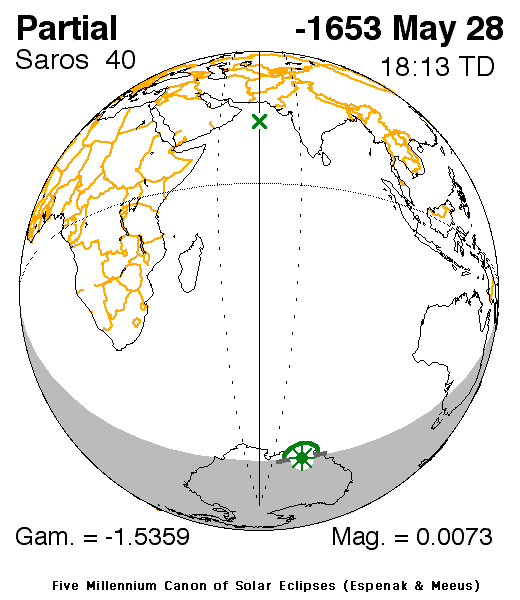 A partial eclipse of the Sun occurred on 28 May, 1654 BC UT Old Style, with maximum eclipse at 07:32 UT. With only 1% of the Sun covered at maximum eclipse, this was a very marginal eclipse at best, and rather uninteresting.