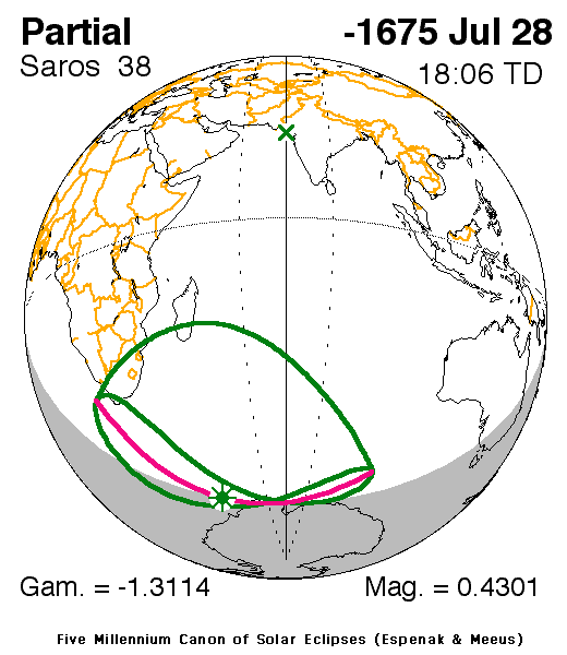 A partial eclipse of the Sun occurred on 28 July, 1676 BC UT Old Style, with maximum eclipse at 07:17 UT. A small partial eclipse barely darkened the Sun. With just 43% of the Sun covered for viewers closest to the center, this was of limited interest.