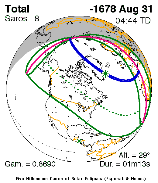 A total eclipse of the Sun occurred on 30 August, 1679 BC UT Old Style, with maximum eclipse at 17:55 UT. The Sun was darkened for 1 minute and 13 seconds by a dramatic total eclipse covering a path up to 132 km wide. This was a sight worth seeing.