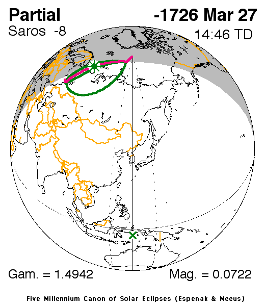 A partial eclipse of the Sun occurred on 27 March, 1727 BC UT Old Style, with maximum eclipse at 03:38 UT. With only 7% of the Sun covered at maximum eclipse, this was a very marginal eclipse at best, and rather uninteresting.