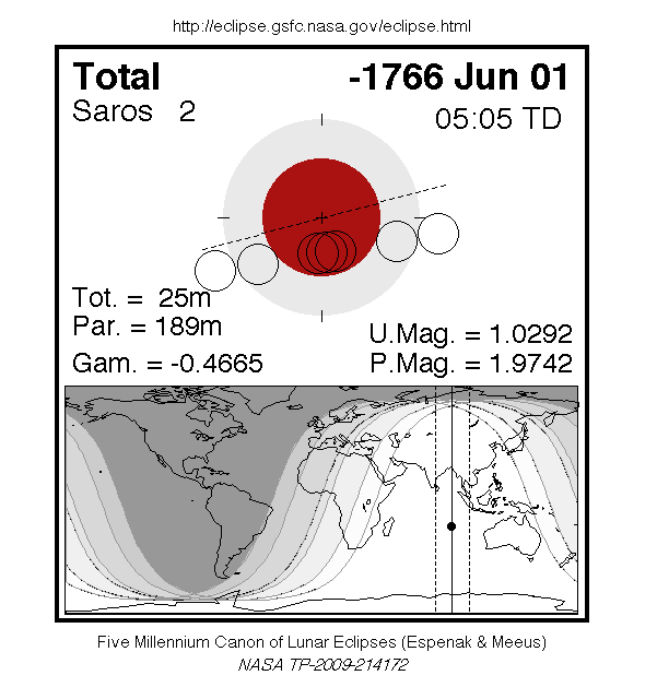 A total eclipse of the Moon occurred on 31 May, 1767 BC UT Old Style, with maximum eclipse at 17:42 UT. The Moon barely edged into total eclipse for 25 minutes and 24 seconds. With the Moon just 3% of its diameter into the Earth's umbral shadow, the Moon may have been quite bright, but even so, this should have been worth seeing. The partial eclipse lasted for 3 hours and 9 minutes in total.