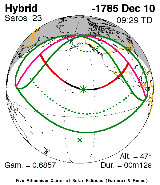 A hybrid eclipse of the Sun occurred on 9 December, 1786 BC UT Old Style, with maximum eclipse at 21:59 UT. A fleeting hybrid eclipse covered only a tiny path, just 9 km wide and lasted for a brief 12 seconds at the point of maximum eclipse.