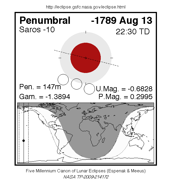 A penumbral eclipse of the Moon occurred on 13 August, 1790 BC UT Old Style, with maximum eclipse at 10:59 UT. This very subtle penumbral eclipse was essentially invisible to the naked eye; though it lasted 2 hours and 27 minutes, just 30% of the Moon's disc was in partial shadow (with no part of it in complete shadow).