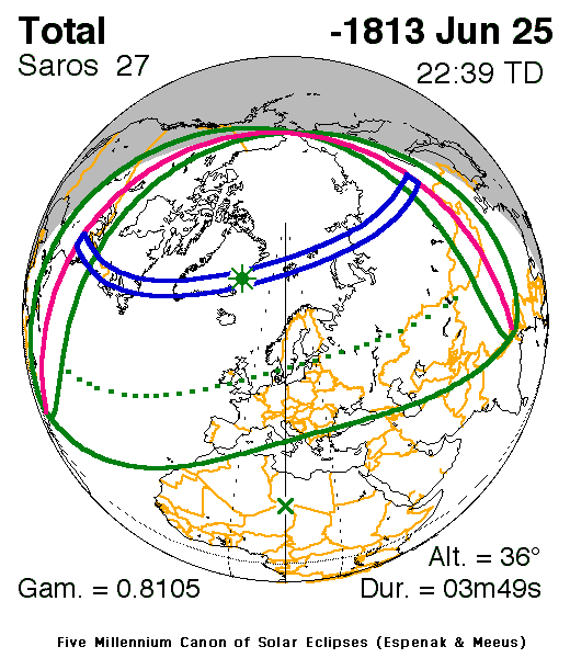 A total eclipse of the Sun occurred on 25 June, 1814 BC UT Old Style, with maximum eclipse at 10:58 UT. A dramatic total eclipse plunged the Sun into darkness for 3 minutes and 49 seconds at maximum, creating an amazing spectacle for observers in a very broad path, 369 km wide at maximum.