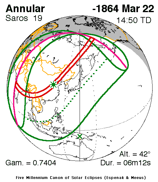 An annular eclipse of the Sun occurred on 22 March, 1865 BC UT Old Style, with maximum eclipse at 02:50 UT. A small annular eclipse covered only 94% of the Sun in a very broad path, 326 km wide at maximum, and lasted 6 minutes and 12 seconds.