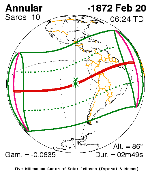 The annular eclipse lasted for 2 minutes and 49 seconds. Maximum eclipse was at 18:20:11 UT.
