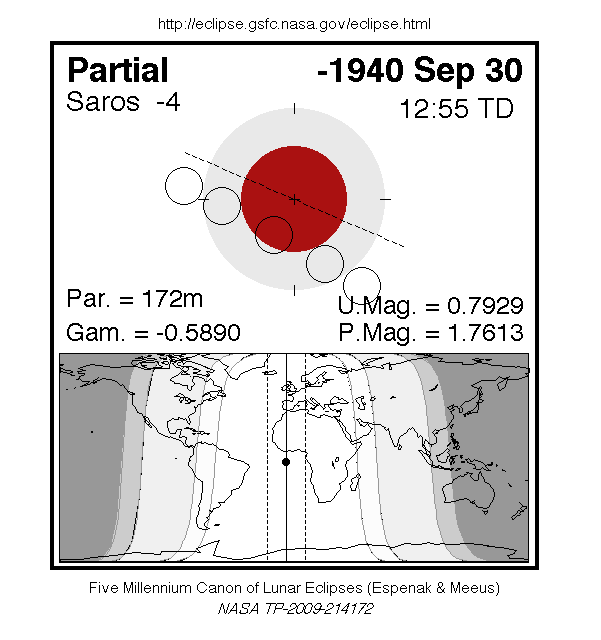 A partial eclipse of the Moon occurred on 30 September, 1941 BC UT Old Style, with maximum eclipse at 00:24 UT. The Moon was strikingly shadowed in this deep partial eclipse which lasted 2 hours and 52 minutes, with 79% of the Moon in darkness at maximum.