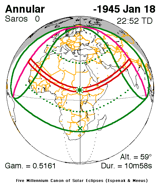 An annular eclipse of the Sun occurred on 18 January, 1946 BC UT Old Style, with maximum eclipse at 10:19 UT. A small annular eclipse covered only 92% of the Sun in a very broad path, 333 km wide at maximum, and lasted 10 minutes and 58 seconds.