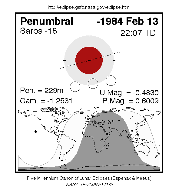 A penumbral eclipse of the Moon occurred on 13 February, 1985 BC UT Old Style, with maximum eclipse at 09:19 UT. This subtle penumbral eclipse may have been visible to a skilled observer at maximum eclipse. 60% of the Moon's disc was partially shaded by the Earth (none of it was in total shadow), which caused a gentle shadow gradient across its disc at maximum; the eclipse as a whole lasted 3 hours and 49 minutes.