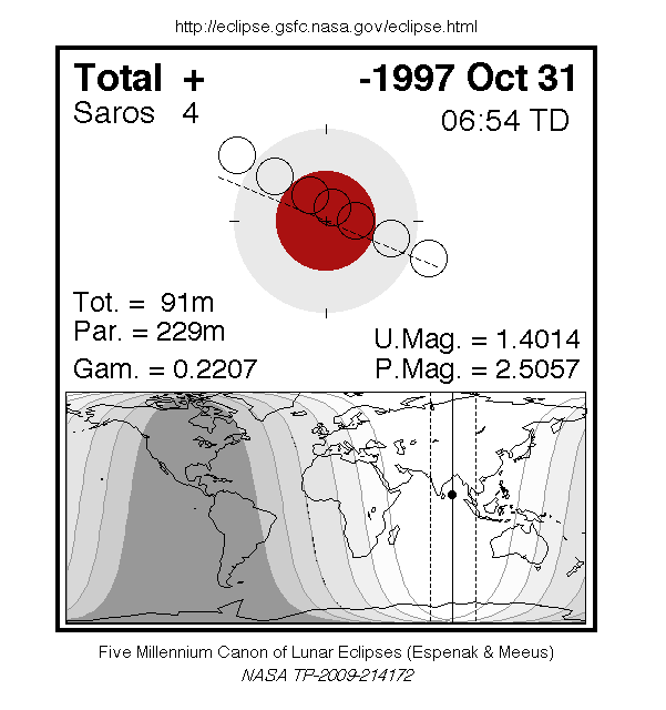 The penumbral eclipse lasted for 6 hours and 14 minutes. The partial eclipse lasted for 3 hours and 49 minutes. The total eclipse lasted for 1 hour and 31 minutes. Maximum eclipse was at 18:01:09 UT.