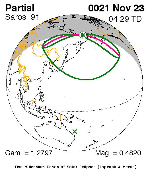 A partial eclipse of the Sun occurred on 23 November, 0021 UT Old Style, with maximum eclipse at 01:36 UT. A small partial eclipse barely darkened the Sun. With just 48% of the Sun covered for viewers closest to the center, this was of limited interest.